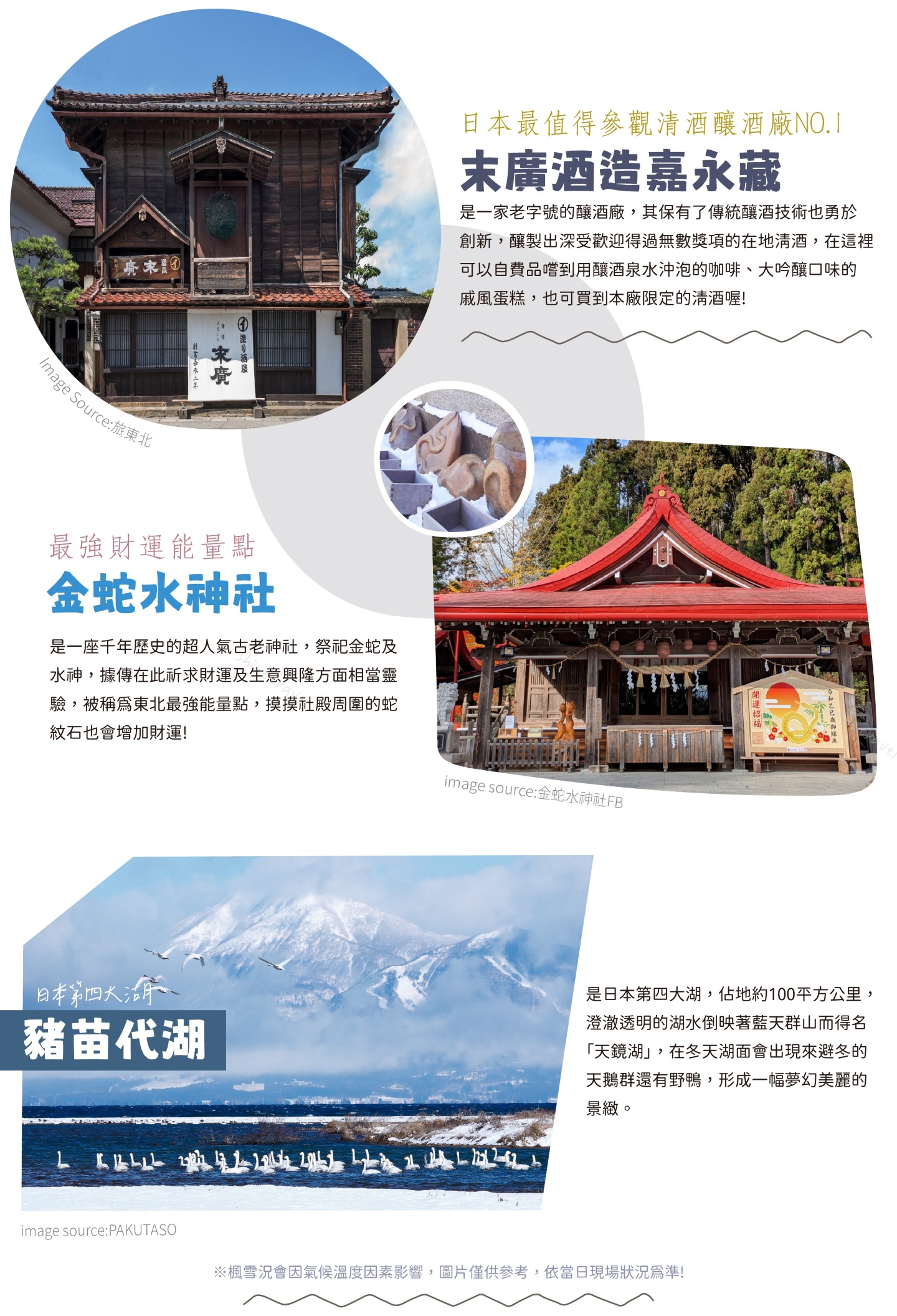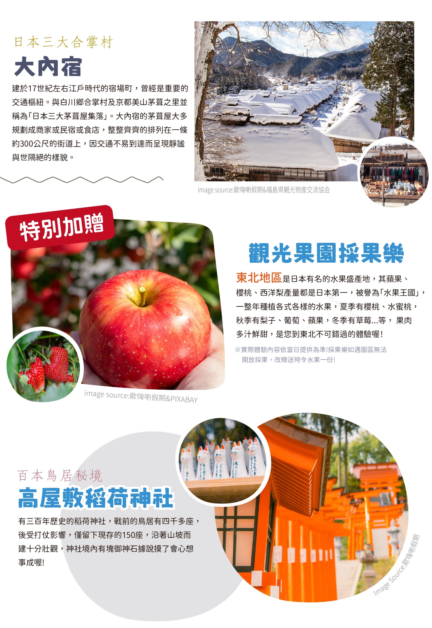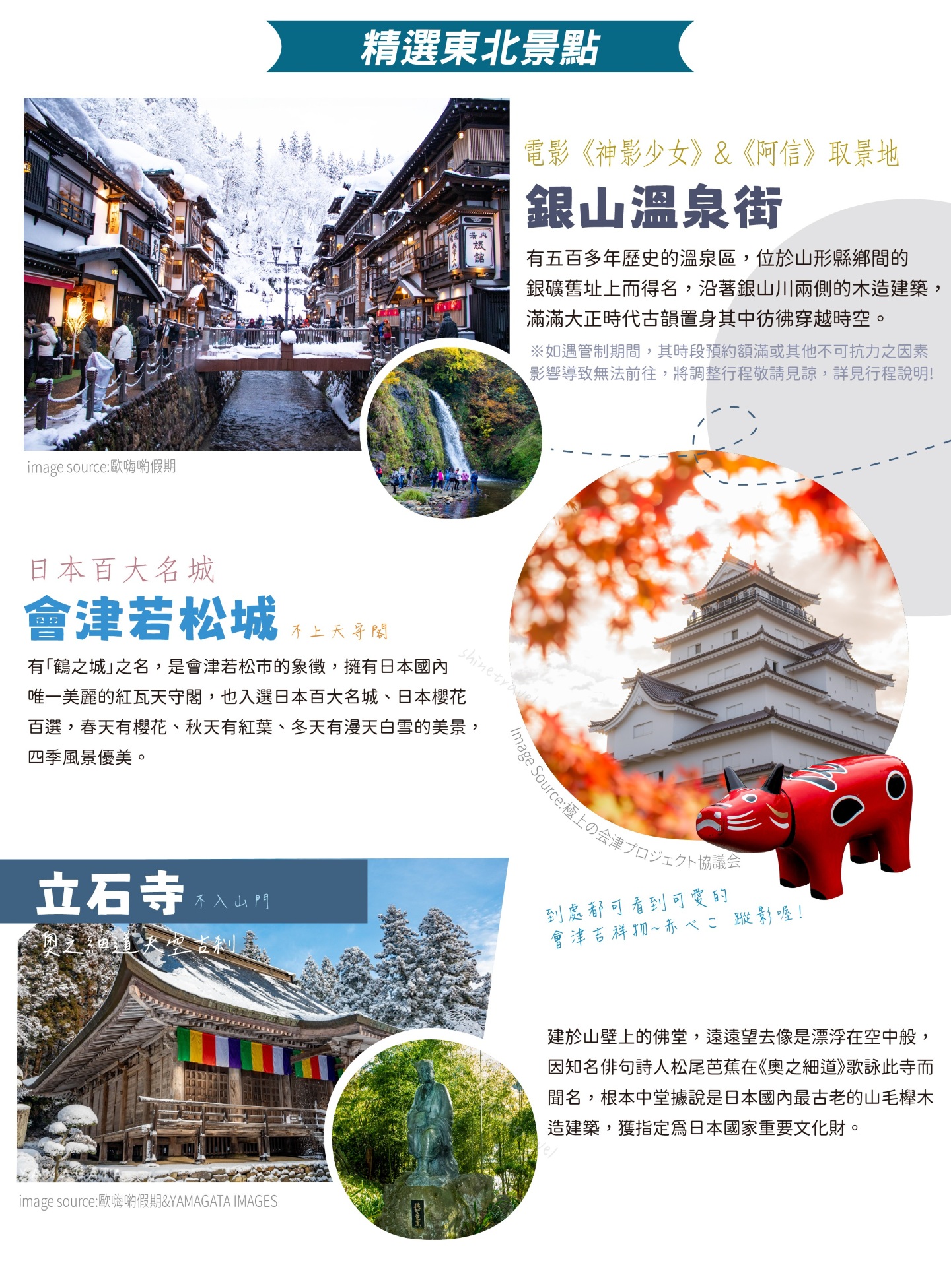 ※備註說明:因銀山溫泉實施時段人數管制公告,實施期間為12月初至2026年3月底(詳見官網公告),如遇時段預約額滿或其他不可抗力因素之影響導致無法前往,將改前往奧州三大名湯~飯坂溫泉街散策,敬請見諒!