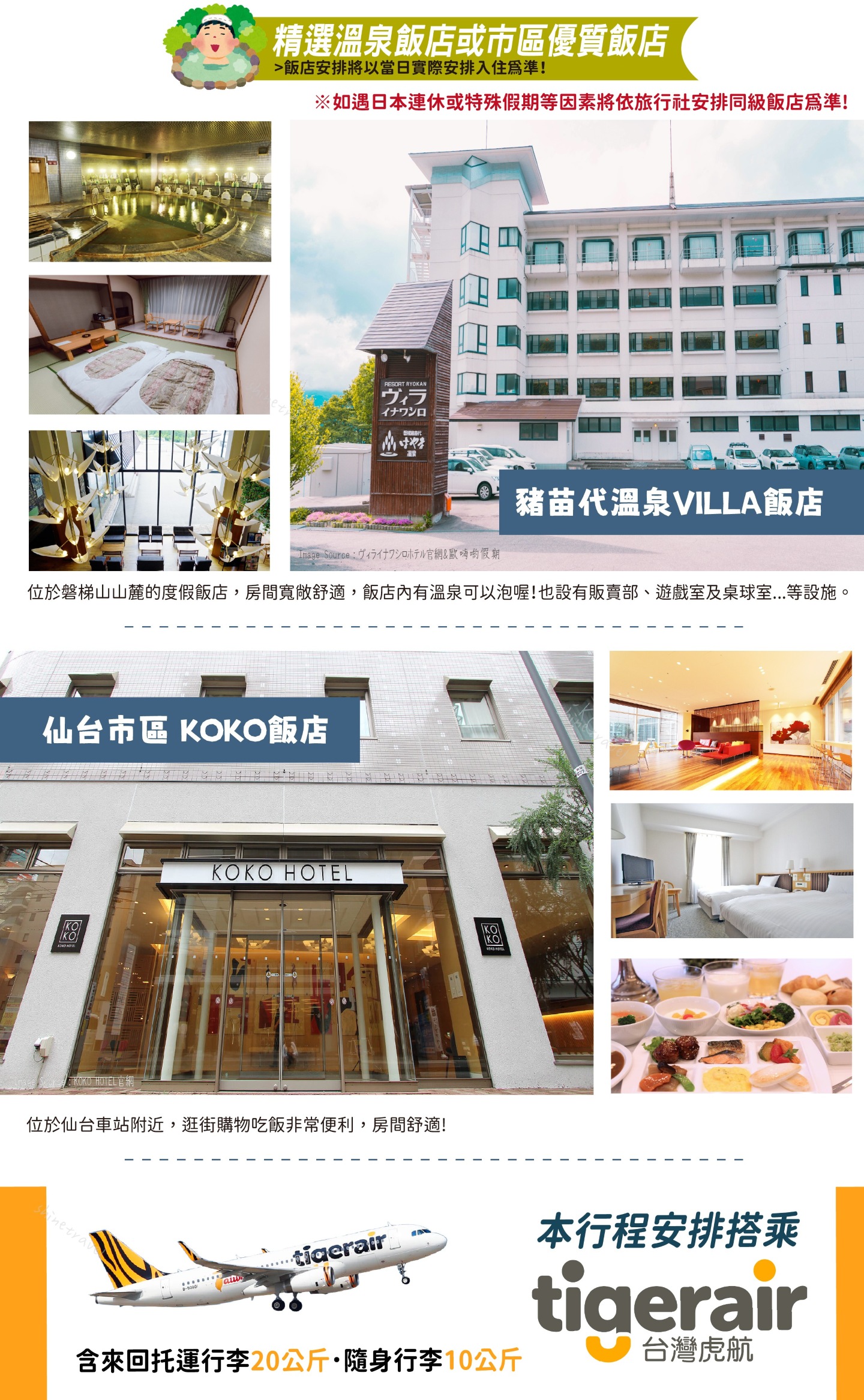住宿:仙台珍珠城市飯店 或仙台綠色山丘高級飯店 或仙台ROUTE INN系列 或仙台COMFORT系列 或仙台KOKO系列 或仙台Hills飯店 或仙台太陽廣場飯店 或仙台APA系列 或宮城利府ROUTE INN系列 或宮城名取ROUTE INN系列 或宮城大崎古川APA系列 或宮城多賀城ROUTE INN系列 或福島COMFORT系列 或福島ROUTE INN系列 或福島RICHMOND系列 或二本松ROUTE INN系列 或郡山ROUTE INN系列 或同等級