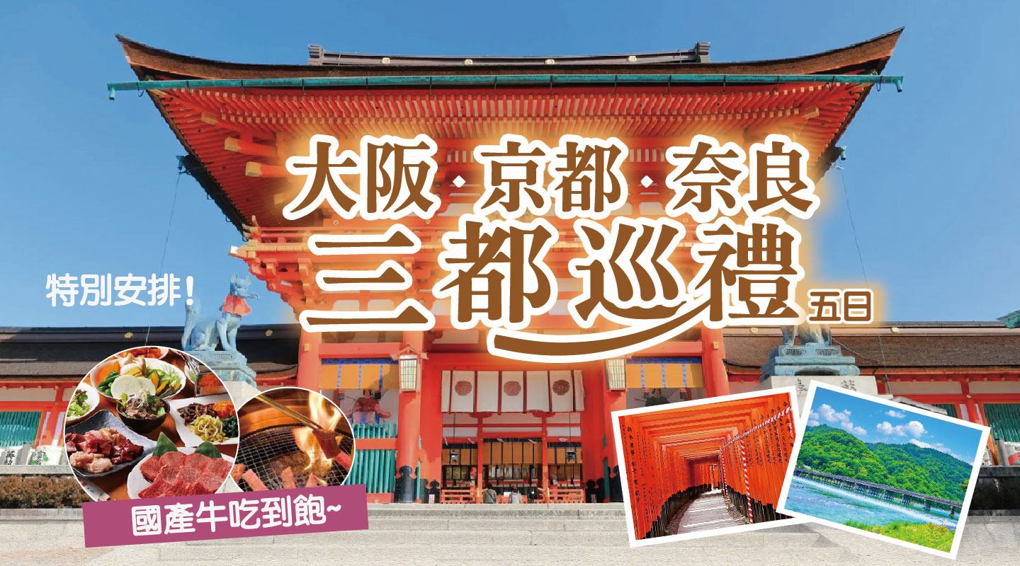 【限量促銷】大阪京都奈良三都巡禮嵐山渡月橋.清水寺.伏見稻荷大社.奈良鹿公園+國產牛吃到飽精選五日(亞洲航空)