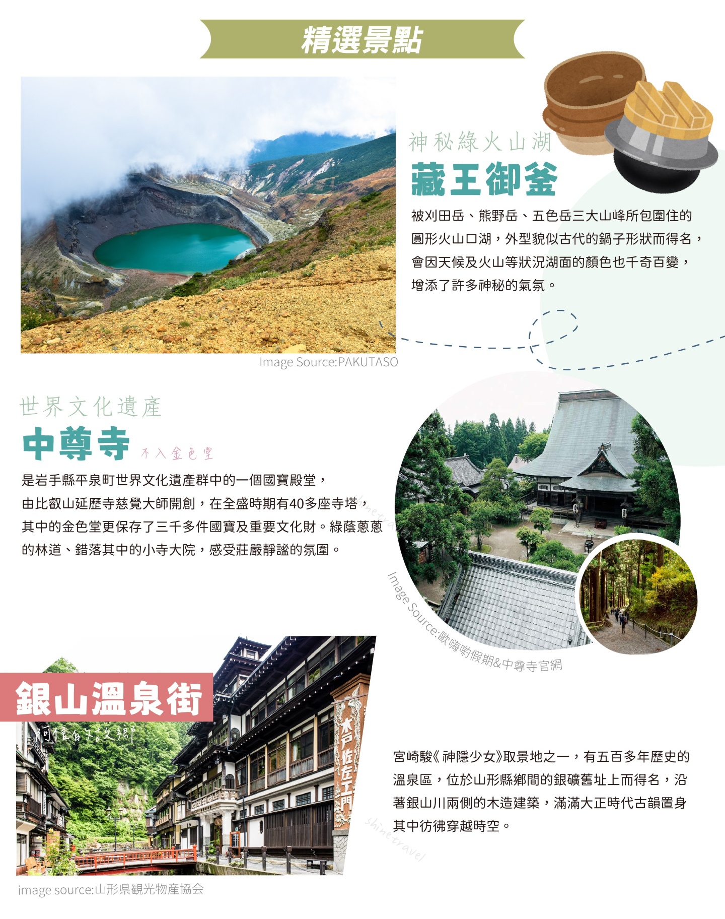 【藏王御釜】是「刈田岳」、「熊野岳」、「五色岳」3座山環抱下的火口湖,與樹冰同為藏王地標。御釜名稱來自火口湖有如鍋子一般的形狀,隨太陽光線不同,顏色時而是深綠色時而又變成藍色,隨觀看角度不同風貌千變萬化,深深吸引來訪的觀光客。