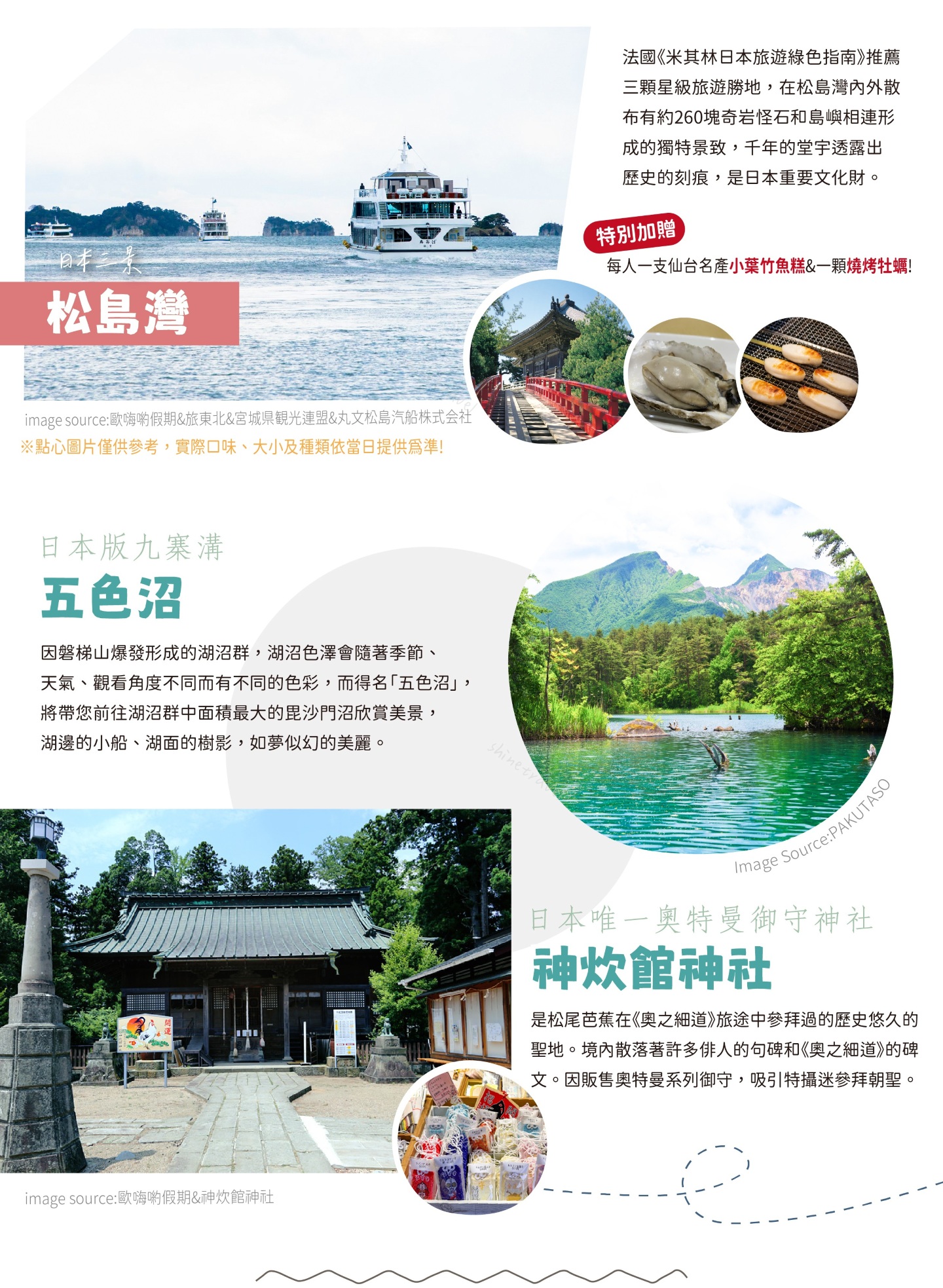 住宿:仙台綠色山丘高級飯店 或仙台ROUTE INN系列 或仙台COMFORT系列 或仙台KOKO系列 或仙台Hills飯店 或仙台太陽廣場飯店 或仙台APA系列 或宮城利府ROUTE INN系列 或宮城名取ROUTE INN系列 或宮城大崎古川APA系列 或宮城多賀城ROUTE INN系列 或福島COMFORT系列 或福島ROUTE INN系列 或福島RICHMOND系列 或二本松ROUTE INN系列 或郡山ROUTE INN系列 或同等級