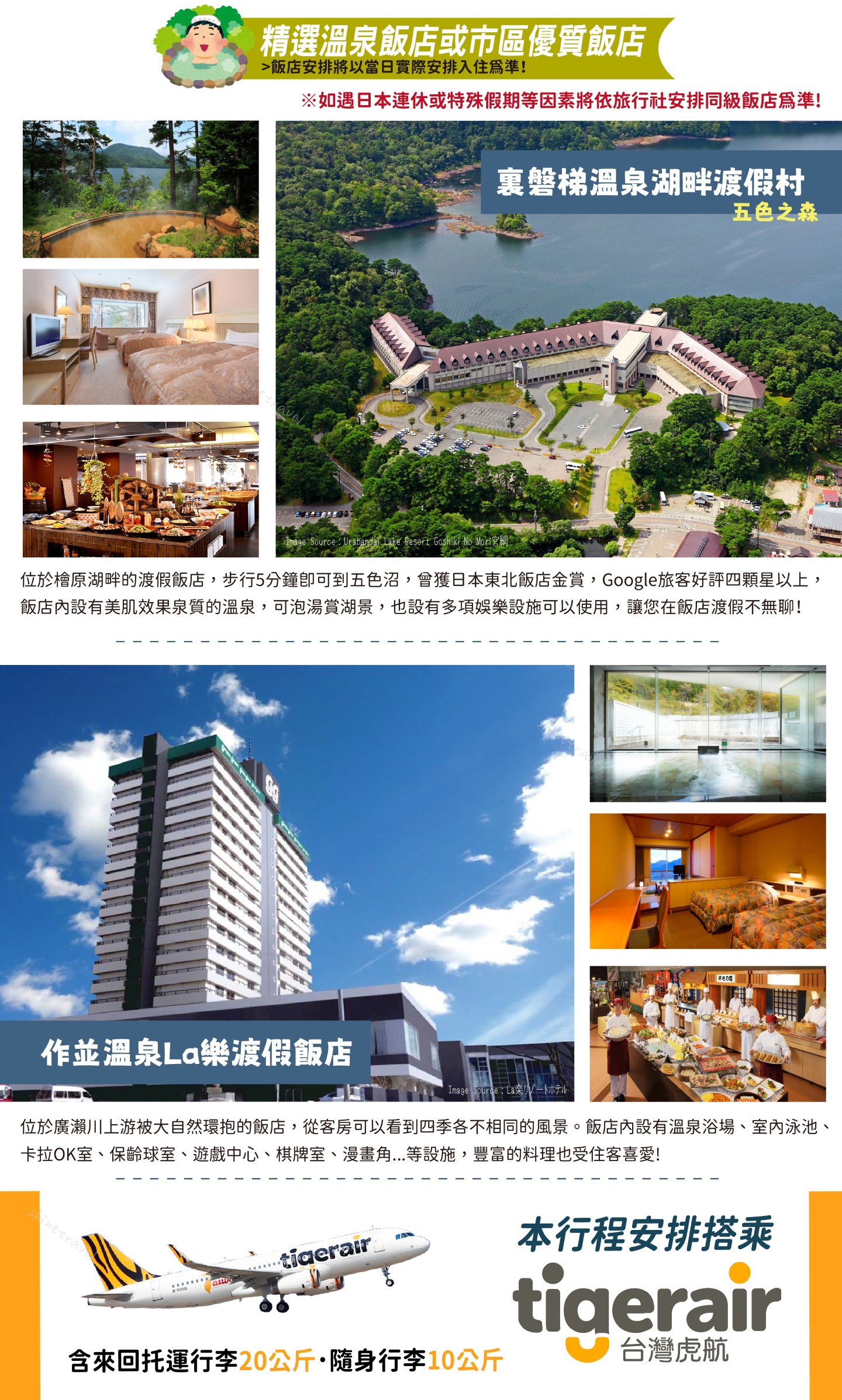 住宿:裏磐梯溫泉湖畔渡假村五色之森 或高湯溫泉花月高原飯店 或裏磐梯美居溫泉度假飯店 或豬苗代溫泉利時達飯店 或蘆之牧溫泉格蘭飯店 或東山溫泉大江戶溫泉物語格蘭飯店 或同等級
